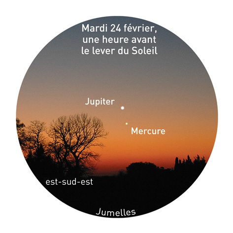 Le mardi 24 février 2009, une heure avant le jour, Mercure et Jupiter sont visibles à moins d’un demi-degré l’une de l’autre au ras de l’horizon est-sud-est.