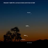 Dimanche 1er juillet 2012, à l’aube, une heure et demie avant le lever du Soleil, un peloton scintillant d’étoiles et de planètes grimpe un beau col céleste au-dessus de l’horizon est-nord-est.