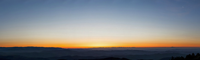 Récemment, après une nuit intégralement dédiée à l’observation d’une splendide tapisserie stellaire printanière, j’ai replié mes instruments, chargé mon véhicule et roulé quelques minutes jusqu’à l’observatoire météorologique du mont Aigoual, dans les Cévennes. Debout sur la terrasse, face au jour naissant dans un silence absolu, j’ai composé ce vaste panorama pour vous faire partager cet instant privilégié. Cliquez sur cette image pour en ouvrir une autre, bien plus grande, dans laquelle vous pourrez littéralement plonger pour survoler les plans et les arrières plans jusqu’au mince croissant lunaire qui surplombait la scène. Bonne rêverie…