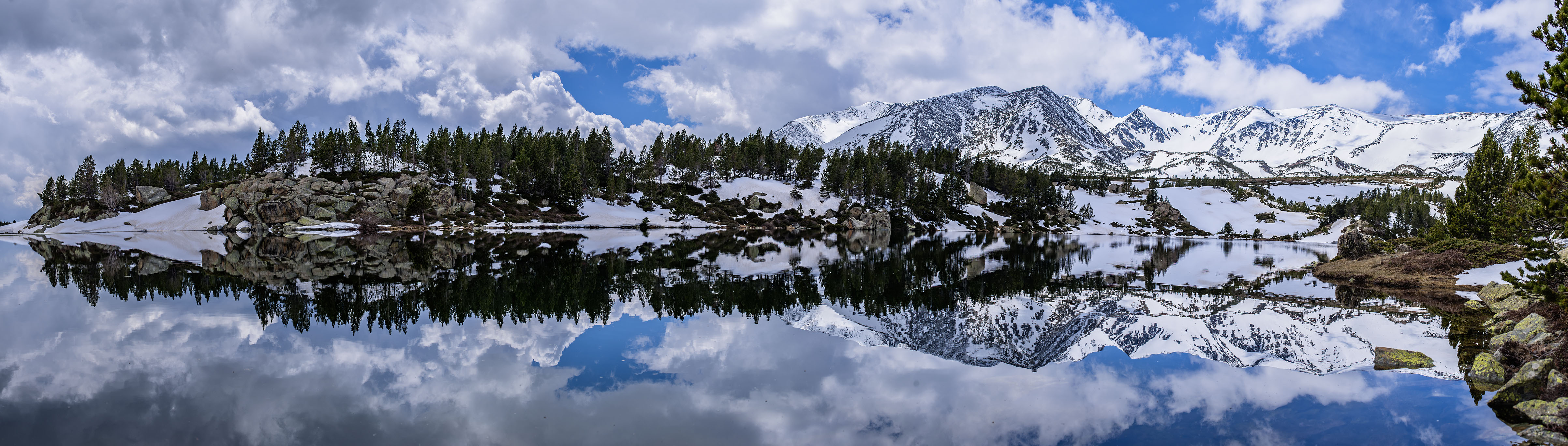 Si, comme moi, vous êtes fascinés par les reflets, voici un immense panoramique montrant le massif du Carlit et son reflet dans l'étang de la Coumasse.