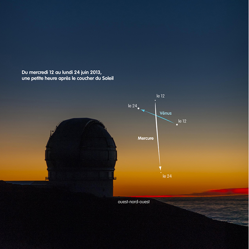 Du mercredi 12 au lundi 24 juin 2013, au crépuscule, une petite heure après le coucher du Soleil, suivez le croisement des trajectoires de Vénus et de Mercure. Vénus est facile à repérer à l’œil nu au-dessus de l’horizon ouest-nord-ouest, mais, pour Mercure, des jumelles seront sûrement utiles si votre ciel n’est pas limpide.