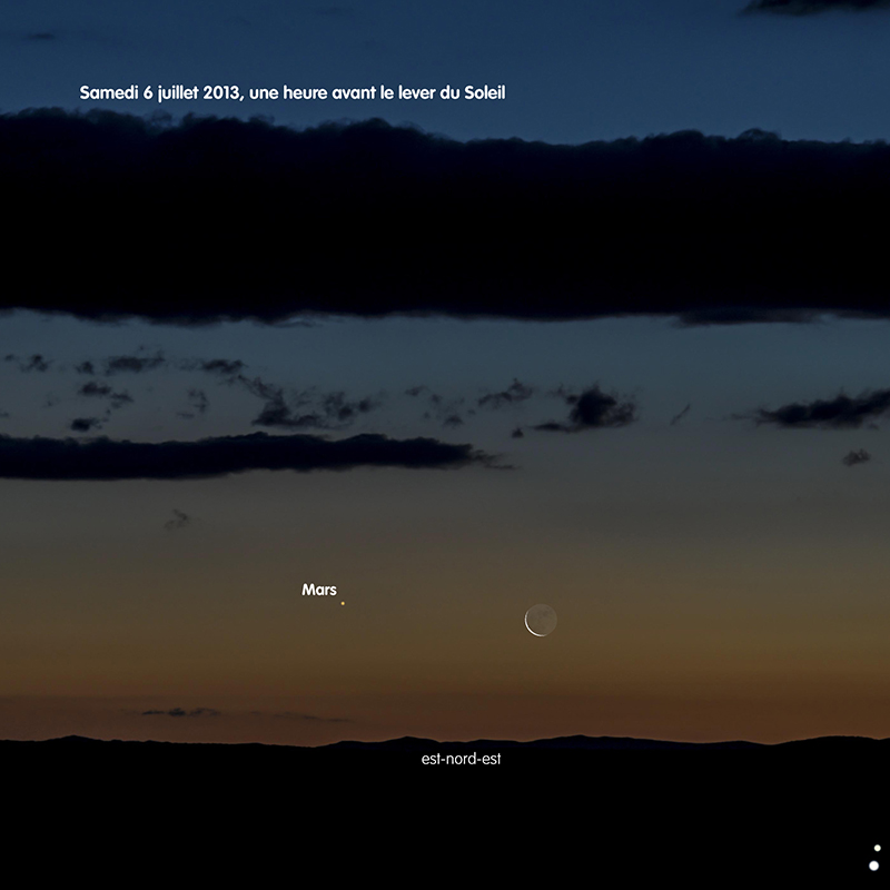 Samedi 6 juillet 2013, à l’aube, une heure avant le lever du Soleil, tentez de repérer à l’œil nu le petit point martien, juste au-dessus de l’horizon est-nord-est. Le mince croissant lunaire aisément visible à moins de 6 degrés sur sa droite devrait vous simplifier la tâche.