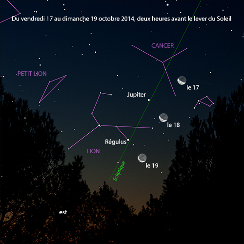 Du vendredi 17 au dimanche 19 octobre 2014, la Lune en croissant passe à proximité du point éclatant de Jupiter. Ces astres sont visibles à plus de 40° de hauteur au-dessus de l’horizon est...